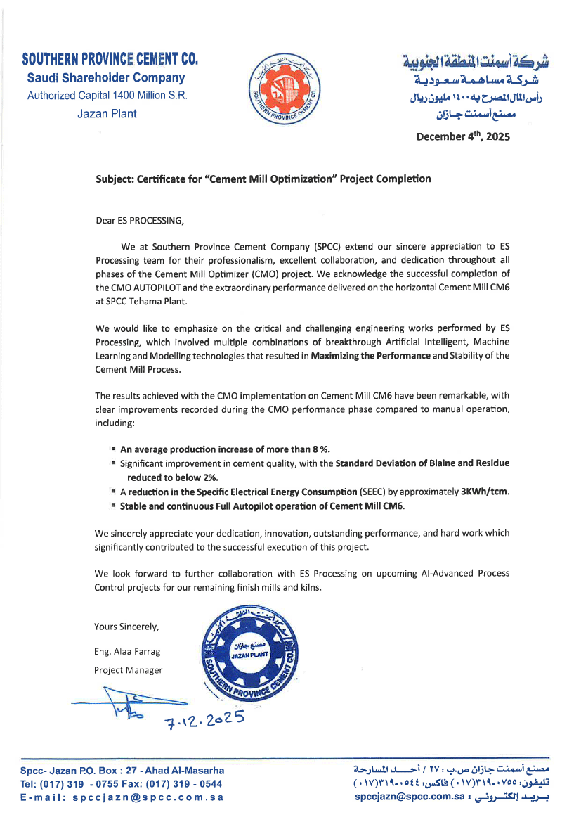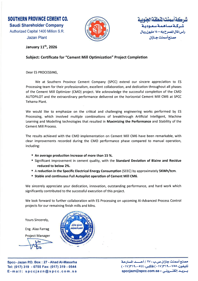 We are proud to announce the very successful completion and handover of the Cement Mill Optimizer (CMO) project implemented on Cement Mill CM6 at Southern Province Cement Company (SPCC), Tehama Plant – KSA.