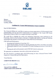 We, Ciment de Sibline sal, would like to express our sincere appreciation to ES-Processing for their professionalism and the Successful Implementation & Completion of the Cement Mill Process Optimization Project (CMO) on our largest horizontal Cement Mill.
